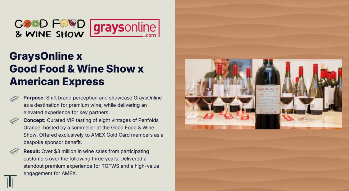 Play: Created an exclusive Penfolds Grange tasting event for AMEX members inside a major food and wine show, using lots from Grays’ own catalogue.